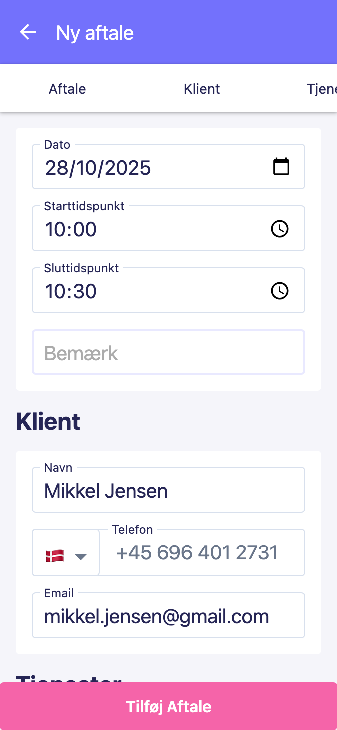 Konfigurer dine tjenester, priser og personaletilgængelighed.