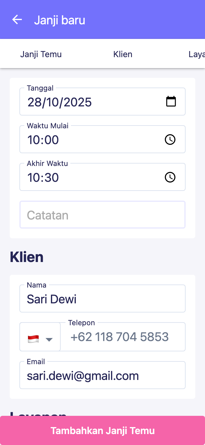 Simpan catatan klien terperinci termasuk riwayat layanan, preferensi, dan informasi kontak, semuanya di satu tempat.